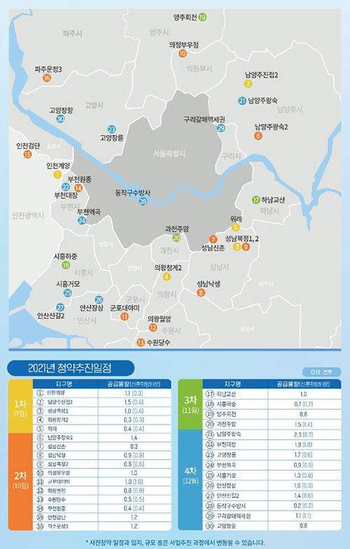 1차 물량 4천333호는 3기 신도시인 인천계양 1천50호, 남양주 진접2 1천535호, 성남 복정1 1천26호, 위례신도시 418호, 의왕 청계2 304호 등입니다.