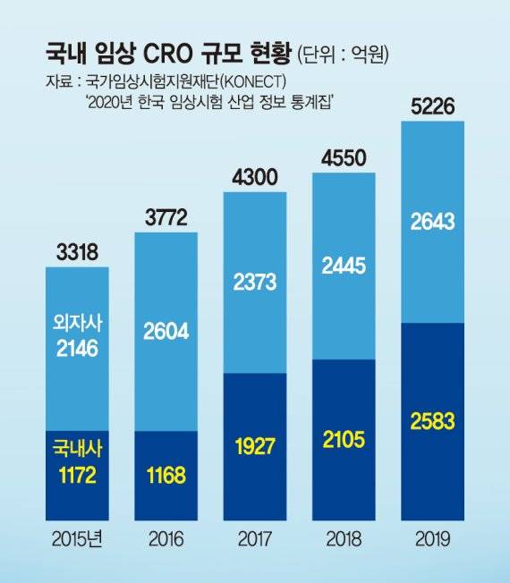 제약·바이오 기업들은 보다 효율적인 신약개발을 위해 신약개발 과정에서 가장 많은 비용과 시간을 차지하는 임상을 CRO에 아웃소싱하는 추세다. CRO는 의약품 개발에서 가장 마지막이자 가장 핵심 단계라고 할 수 있는 임상시험을 수탁 받아 진행하는 전문 기관이다. 제약·바이오 기업과 떼려야 뗄 수 없는 신약개발 동반자다. 2000년 초반 등장한 국내 CRO는 20년간 성장을 거듭하며 2019년 5226억원 규모로 성장했다. 국내 CRO 시장은 연평균 11.5%의 성장률을 보이며 세계 아웃소싱 시장보다 빠른 속도로 커지고 있다. 특히 토종 CRO는 시장 내 입지를 넓히며 연평균 약 20%의 가파른 성장세를 보이고 있다. 2017년에는 처음으로 국내 CRO 시장 점유율이 40%를 돌파했고, 2018년에는 최초로 매출액 2000억원을 넘어섰다.