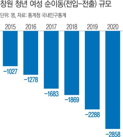 통계청 국내인구이동통계를 보면, 지난해 경남은 청년(19~34세) 순이동(전입-전출 인구)이 1만8919명까지 늘었다. 2013년(3321명) 이래 순유출 규모는 계속 늘고 있다. 이 중 여성들의 지역 유출이 남성보다 심각하다고 전문가들은 말한다. 창원대 사회학과에서 국내인구이동통계를 분석한 데 따르면 중공업 도시 창원을 중심으로 지난해 청년 순유출은 5180명인데 이 중 청년 여성이 2858명에 달했다. 청년 여성의 순유출은 2014년 1000명을 처음 돌파한 뒤 계속 증가 추세다. 여성이 계속 빠져나가면서 2020년 12월 창원의 청년층 남녀 성비는 1.22 대 1로 전국(1.09 대 1)보다 불균형이 크다.