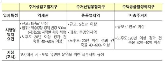 이번 시행령에서는 도심 공공주택 복합사업은 입지 특성에 따라 주거상업고밀지구(역세권), 주거산업융합지구(준공업지역), 주택공급활성화지구(저층주거지)로 구분했다.