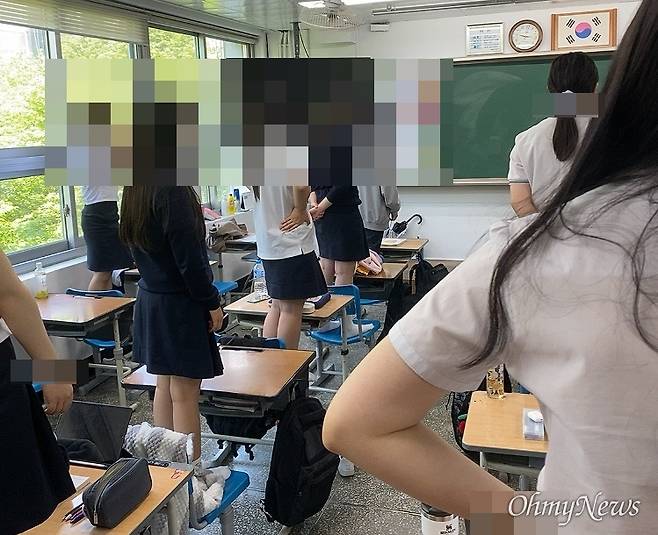 16일 <오마이뉴스>는 강원도에 있는 A고교 학생이 기자에게 메일로 보낸 교복검사 제보 글과 교복 검사 사진 파일을 살펴봤다. 본인을 3학년 학생으로 소개한 이 학생은 실명 제보 글을 통해 "7월 14일 6교시 중에 3학년 교복불시검문이 있었다"면서 "3학년 ○반 담임 B선생님(남)과 3학년 △반 담임 C선생님(여) 등이 각기 다른 반에서 학생들을 의자 위로 올라가게 명령했다"고 설명했다.