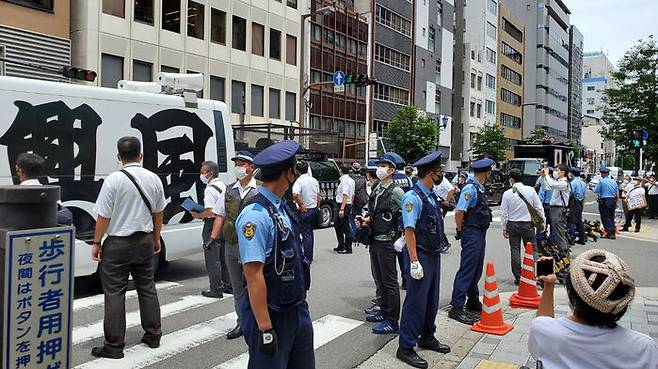 오사카부립 노동센터 '엘·오사카'에서 막을 연 이 전시회는 현지 경찰의 삼엄한 경비 속 진행됐습니다.