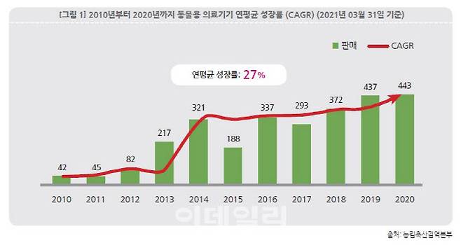 [이데일리 송영두 기자] 최근 코로나19로 인해 외부 활동이 줄고 집에서 보내는 시간이 늘어나면서 반려동물 시장이 확대되고 있다. 농림축산검역본부에 따르면 2010년부터 2020년까지 동물용 의료기기 연평균 성장률은 27%에 달한다. 한국바이오협회 ‘동물용 의료기기 시장과 전망’ 리포트를 통해 동물용 의료기기에 대해 알아본다.