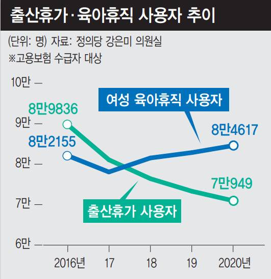 정규직 여성 가입률 88.1%, 비정규직 여성 가입률 46%(2020년 8월 기준)인 고용보험을 통해 출산휴가 사용 현황을 간접적으로 유추해볼 수 있다. 강은미 정의당 의원이 고용노동부로부터 제출받은 최근 5년간 자료를 보면, 고용보험 가입자 중 출산휴가 사용 인원(출산휴가 미사용 규모는 파악 안 됨)은 2016년 8만9836명, 2017년 8만1092명, 2018년 7만6414명, 2019 7만3306명, 2020년 7만949명으로 지속적으로 감소했다. 이 기간 출생아 수는 2016년 40만6243명에서 2020년 27만2400명으로 줄었다. 출생률 감소에 따른 영향으로만 해석할 수는 없다. 같은 기간 여성 육아휴직 사용자는 8만2155명(2016년)에서 8만4617명(2020년)으로 큰 차이를 보이지 않았다. 여성 노동자가 일터에서 맞닥뜨린 출산휴가라는 문턱은 좀처럼 낮아지지 않고 있는 셈이다.