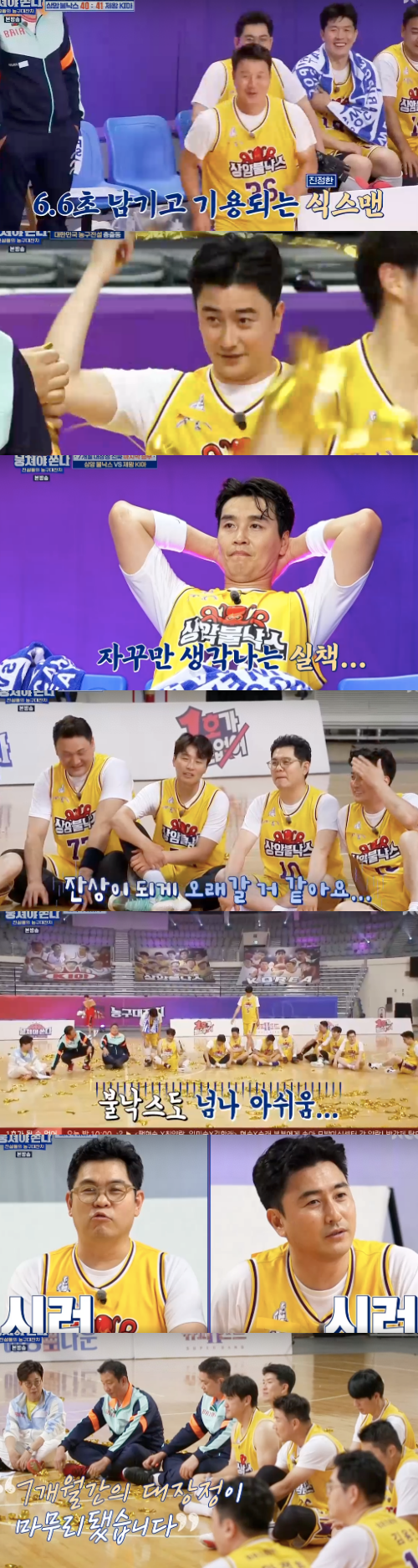 그 사이, 단 한점만을 남기고 마지막 작전타임을 하기로 했다. 허재는 “이제 팀파울, 13초 남았으니 파울로 끊고 자유투를 받자”면서 초조하지 않게 멤버들을 다독였다. 그러면서 안정환이 파울로 경기를 끊기로 작전을 짰다.