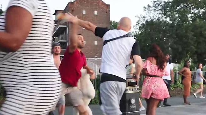 그러자 견주의 지인으로 보이는 두 남성이 얼굴을 맞대고 거친 말을 주고받는 듯하더니 흰색 옷 남성의 지인이 빨간색 옷 남성의 얼굴을 때립니다.
