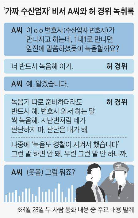 A씨는 이 변호사와 통화뿐 아니라 허 경위와의 통화도 녹음했다. 본지는 그 가운데 지난 4월 28일 허 경위와 A씨의 통화 녹음 파일 2개를 입수했다. 이 파일에 따르면, A씨가 “이 변호사가 만나자고 한다”며 “일대일로 만나면 앞전에 말씀하셨듯이 녹음을 해야 하느냐”고 묻자, 허 경위는 “반드시 녹음하라”고 했다. 이어 허 경위는 “녹음기 따로 준비하더라도 반드시 하라”면서 “네가 직접 하는 대화니까 상관없다”고도 했다. 대화 당사자가 녹음하는 것은 불법이 아니라는 취지였다.