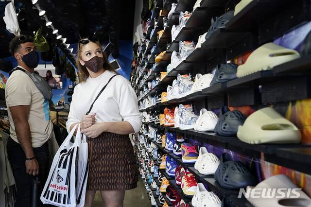[로스앤젤레스=AP/뉴시스] 19일(현지시간) 미 캘리포니아주 로스앤젤레스(LA)의 페어팩스 구역에 있는 한 상점에서 마스크를 착용한 시민들이 물건을 고르고 있다. LA 카운티는 최근 증가하는 코로나19 확진 사례로 실내 마스크 사용을 다시 의무화했다. 2021.07.20.