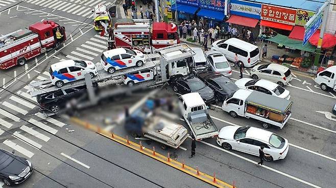 오늘(20일) 오전 8시 56분쯤 전남 여수시 광무동 한재사거리에서 승용차 탁송차량이 횡단보도를 덮친 뒤 건너편 승용차 10대와 잇달아 충돌했습니다.