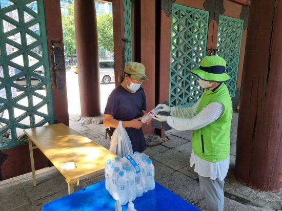 최근 끼니 해결을 위해 이 일대를 찾는 취약계층 어르신들이 지난해보다 두 배 이상 늘어남에 따라 무료급식이 열리는 탑골공원 삼일문과 북문에서 생수 지원을 하고 있다.