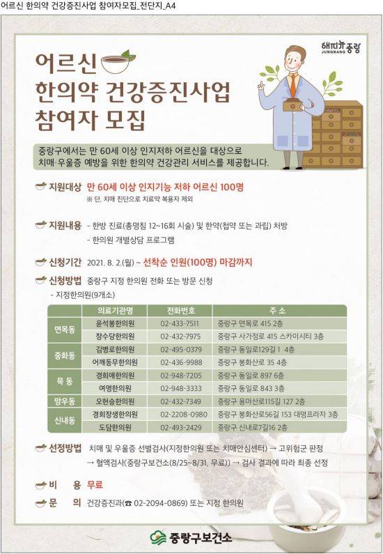8월 2일부터 선착순으로 100명을 모집한다. 참여를 원하는 어르신은 지정 한의원 9개소로 전화 또는 방문 신청하면 된다. 지정 한의원은 ▲윤석봉한의원, 장수당한의원(면목동) ▲김병로한의원, 어깨동무한의원(중화동) ▲경희애한의원, 여명한의원(묵동) ▲오현승한의원(망우동) ▲경희장생한의원, 도담한의원(신내동)이다.