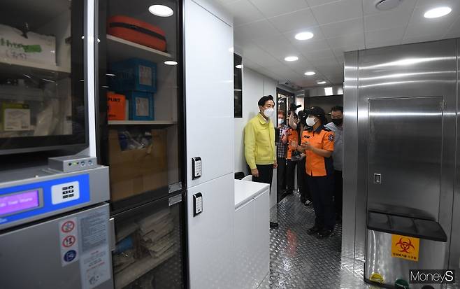 오세훈 서울시장이 21일 오전 서울 중랑구 중랑소방서에 신종 코로나바이러스 감염증(코로나19) 확진자와 백신 접종 이상 반응자 이송 체계 점검차 방문해 장비소독실 내부를 살펴보고 있다.