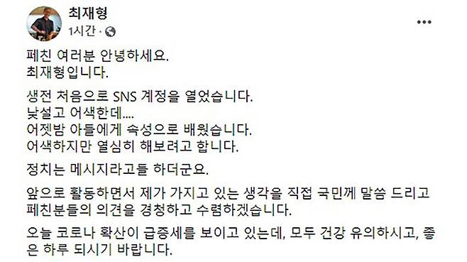 최 전 원장은 오늘 페이스북에 올린 글에 "생전 처음으로 SNS 계정을 열었다"며 "어젯밤 아들에게 속성으로 배웠다"고 적었습니다.