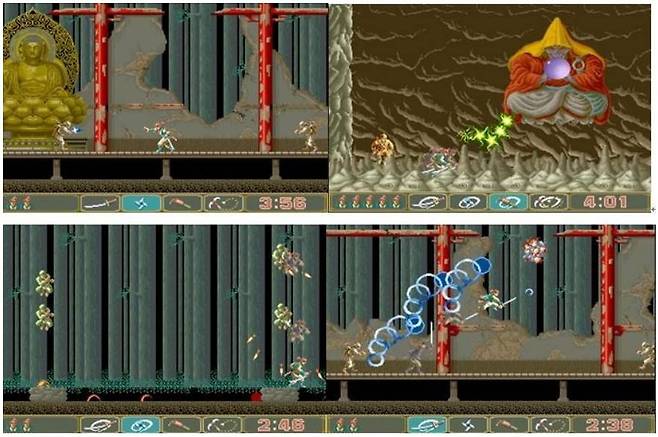 꿀딴지곰 : 그렇죠. 화면 끝까지 이동하는 간단한 구성이지만 녹록한 게임은 아니었습니다. 처음 하면서 100원으로 절대 끝을 깰 수 없는 게임이기도 하고요. 암기해서 진행해야 하는 게임이고, 개인적으로 칼 던지는 녀석들이 양 옆으로 등장할 때 가장 싫었습니다.