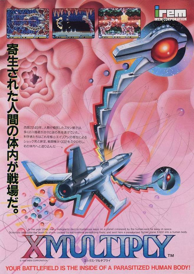 ‘엑스 멀티플라이’는 아이렘이 1989년도에 출시한 그로테스크한 슈팅게임으로, 1999년도에 플레이스테이션1과 세가새턴으로 출시된 바 있죠. 알타입하고 비슷하면서도 다른 스토리를 가지고 있는데요, 이 게임에는 아주 미세한 크기의 외계인이 등장합니다.