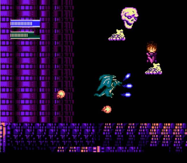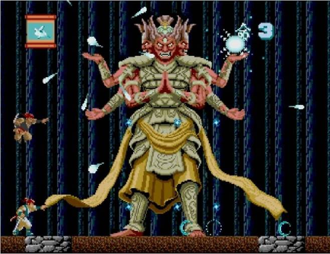 보다 업그레이드된 점프력에(버튼을 누르고 있으면 더욱 높이 올라가서 화면위로 사라질 정도) 분신술과 보호막 다양한 무기(사슬낫, 폭탄, 일본도, 수리검)등으로 무장한 본 작품은 극악의 난이도를 자랑하기도 하는데요, 이후 이식된 PC엔진판에서는 난이도가 다소 하락되었다곤 하지만 수많은 액션 유저들을 울리기도 했습니다.