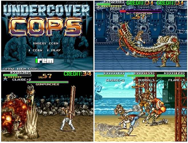꿀딴지곰 : 1992년에 아이렘에서 출시한 '언더커버캅스'!! 이전에 소개해드린 '비질란테'와는 천지개벽이라고 할 정도로 개발력이 올라간 모습을 보여줍니다. 이후 시리즈도 그렇지만, 아이렘은 도트 그래픽을 표현하는데 있어서 특유의 지저분한 분위기가 있습니다.
