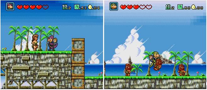 ‘영의 전설’처럼 끝이 안보일 정도로 높게 솟은 나무가 가득한 숲에서 가지를 타고 높이 높이 점프하며 진행하는 점프 액션의 연출이라든가 천장에 매달려서 거꾸로 걸어다니는 연출 등은 2D 게임 임에도 공간감을 느낄수 있는 본 게임의 묘미였죠.