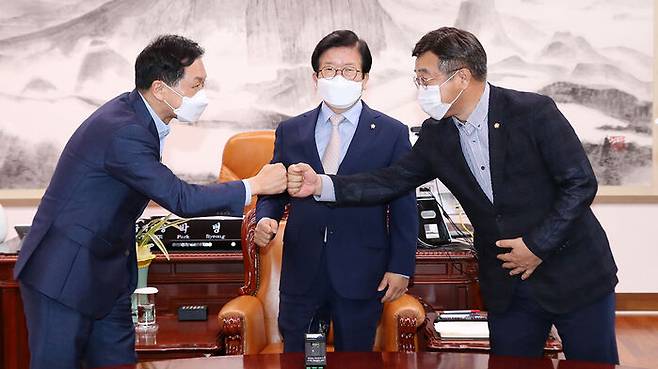 윤호중 더불어민주당 원내대표와 김기현 국민의힘 원내대표는 오늘 오후 박병석 국회의장 주재로 어제 이어 두 번째 회동을 가졌습니다.