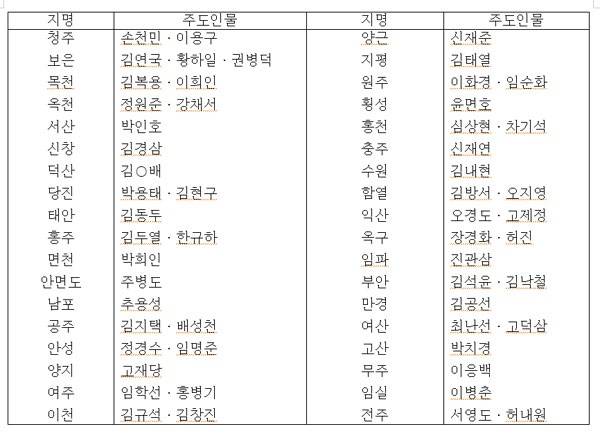 북접 동학농민혁명군의 지역과 주도인물은 다음과 같다. (주석 10)