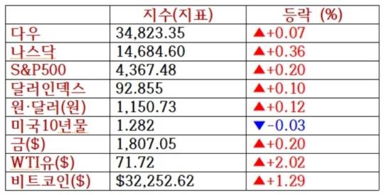 [미국증시 마감시황] ■ 기술주 강세에 사흘째 상승…다우 0.07%↑ 현지시간 22일 뉴욕증시는 주간 실업 지표 등 경제지표 부진에도 기술주 강세에 사흘 연속 상승했다. 다우 지수는 전 거래일보다 0.07% 오른 34,823.35로 거래를 마쳤다. S&P500지수는 0.20% 상승한 4,367.48을, 기술주 중심의 나스닥 지수는 0.36% 오른 14,684.60으로 장을 마감했다. 업종별로 기술주가 0.7% 오르며 상승을 주도했고, 헬스와 임의소비재, 통신 관련주도 강세를 보였다. 에너지와 금융주는 1% 이상 하락했다.