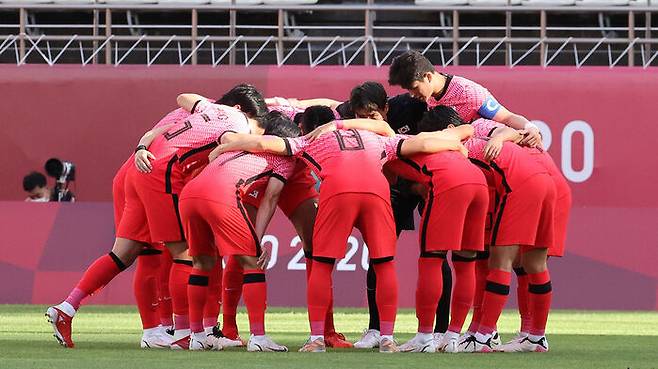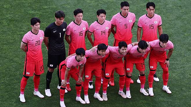 22일 이바라키 가시마 스타디움에서 열린 도쿄올림픽 남자축구 조별리그 B조 1차전 대한민국 대 뉴질랜드 경기. 한국 선수들이 경기 전 기념촬영을 하고 있다.
