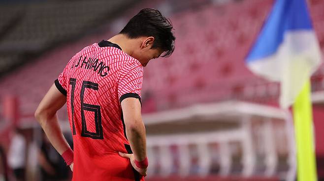 0대 1로 패한 한국의 황의조가 아쉬워하고 있다.