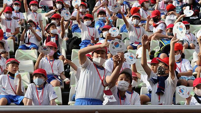 서귀포시 자매도시인 일본 가시마시 초등학교 학생들이 한국을 응원하고 있다.
