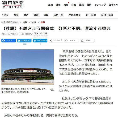 지난 5월 스가 요시히데 총리에게 공개적으로 도쿄올림픽 취소를 촉구해 주목받은 이 신문은 개막식이 열리는 이날 자 지면에 '표류하는 제전'이란 제목의 사설을 게재했습니다.