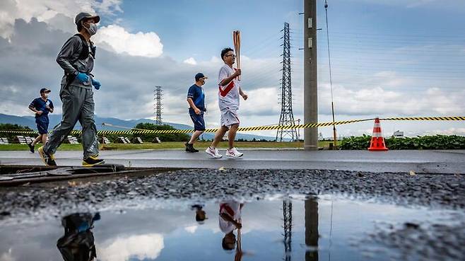 일본 내 성화 봉송은 최근 코로나19 재확산에 따라 도로를 뛰지 않고 성화봉에 불을 서로 넘기는 '토치 키스' 형식으로 진행됐습니다.