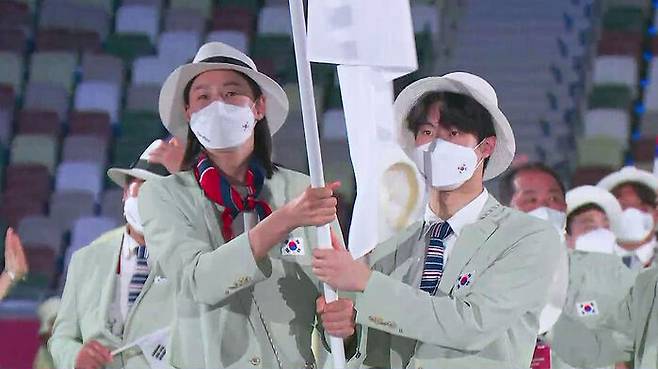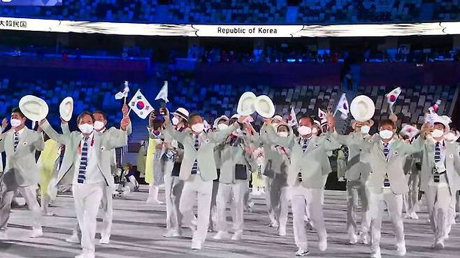 대한민국 선수단은 오늘(23일) 일본 도쿄 올림픽 스타디움에서 막을 올린 개회식에서 일본어로 표기하는 국가 순서에 따라 태국에 이어 103번째로 경기장에 들어왔습니다.