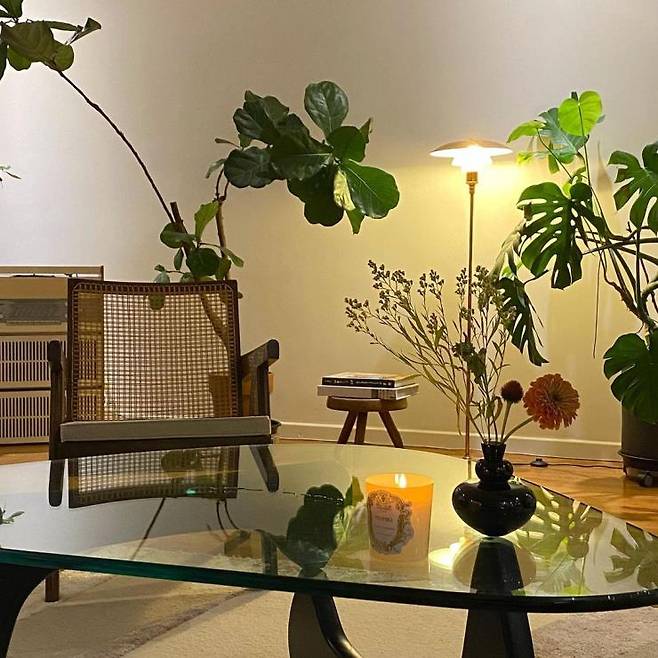 강민경이 10년간 짝사랑한 이 의자는 스위스의 건축가이자 디자이너 피에르 잔느레가 디자인한 ‘Easy Armchair’입니다. 실용적인 디자인을 추구하면서도 동시에 심미안을 갖추기로 유명한 디자이너죠. 건축뿐만 아니라 가구 디자인 능력이 탁월했으며, 인도에 15년간 건축사무소 책임자로 머무르며 연구한 디자인이 그의 의자에 그대로 드러나는 것 또한 매력적입니다. 흔히 구할 수 있었던 목재, 대나무, 줄기 등을 활용해 ‘피에르 잔느레’만의 시리즈가 탄생한 것이죠. 강민경이 픽한 빈티지 의자는 60년 전인 1955-6년에 디자인된 제품으로 컴퍼스 형태의 다리가 팔걸이를 지지하는 독특한 디자인이 특징입니다. 더불어 등받이와 좌석이 하나로 연결되며 살짝 뒤로 젖힌 비대칭 구조로 착석감이 편안하며 몸을 뒤로 기대 쉴 수 있는 의자죠. 강민경은 국내 빈티지 가구 셀렉숍인 원오디너리맨션에서 구매했으며 가격은 약 300만원대.