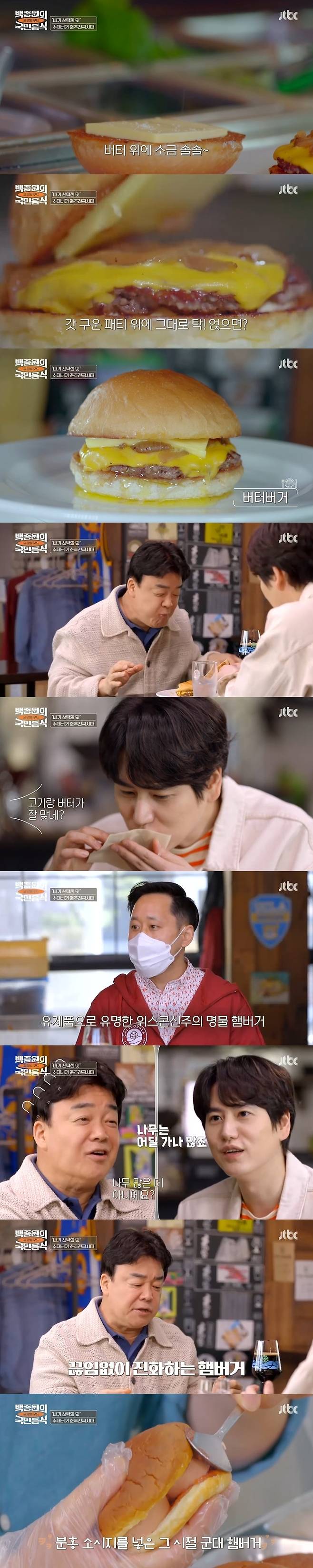 백종원, 규현은 햄버거에 얽힌 본인의 추억과 리얼한 맛 평가로 시청자의 감탄을 불렀다. 다음 주엔 소시지의 어떤 맛과 어떤 유래를 알려줄지 궁금해진다. (사진=JTBC '백종원의 국민음식 - 글로벌 푸드 편' 캡처)