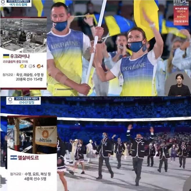 MBC는 어젯(23일)밤 도쿄올림픽 개회식 중계에서 우크라이나 선수단 소개에는 체르노빌 원전 사진을, 엘살바도르 선수단 소개에는 비트코인 사진을 올리는 등 부적절한 사진과 표현으로 비판을 받고 있습니다.
