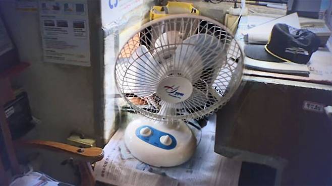 1.7제곱미터 남짓의 좁은 경비실엔 낡은 선풍기 한 대만 돌고 있습니다.