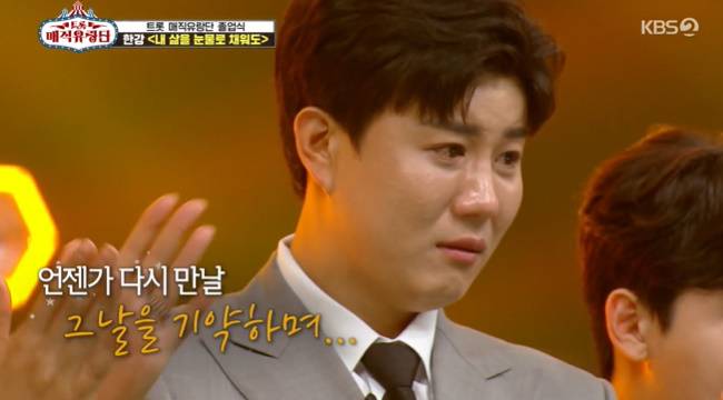 트롯 매직유랑단 반장 한강은 부모님이 좋아하는 곡인 나훈아의 ‘내 삶을 눈물로 채워도’로 엔딩을 장식했다. 무대에 함께 등장한 멤버들은 서로를 얼싸안고 뜨거운 눈물을 흘리며 이별을 아쉬워 했다. 유랑단 멤버들은 9월로 예정된 콘서트를 언급하며 이후 활동도 관심을 가져달라 당부했다. (사진=KBS 2TV '트롯 매직유랑단' 방송 캡처)