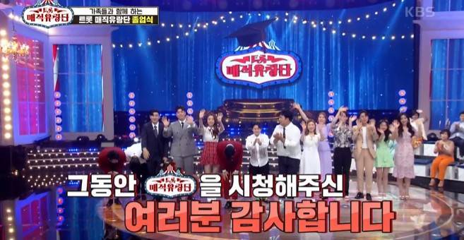 24일 KBS 2TV ‘트롯 매직유랑단’이 4개월여의 여정을 마무리했다. 지난 3월 31일 첫 방송된 ‘트롯매직유랑단’은 각양각색 게스트들과 함께 노래 대결을 펼치는 트롯유랑단(진해성, 재하, 오유진, 신승태, 김용빈, 상호상민, 최향, 한강, 신미래, 설하윤)의 모습이 눈길을 모았다. 송가인이 단장으로 나서고 김신영과 문세윤이 진행자로 프로그램을 이끌었다.