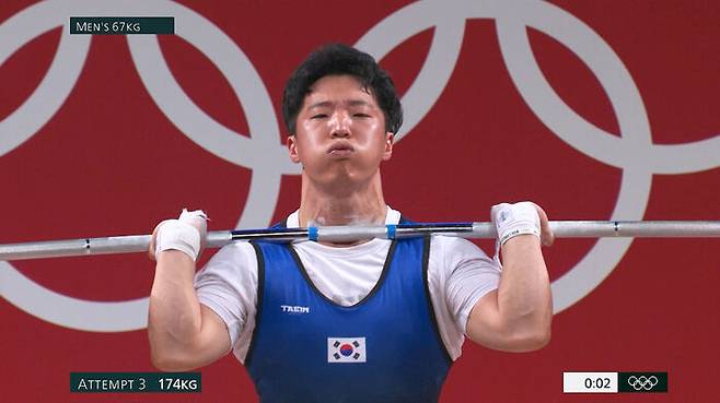 그리고 용상에서 마지막 3차 시기에 이를 악물고 174kg을 들었습니다.