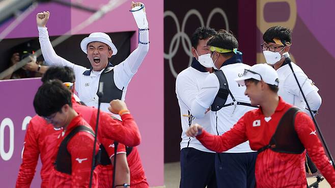 한국 남자양궁이 한일전에서 슛오프 명승부 끝에 승리하고 올림픽 단체전 2연패까지 1승만을 남겼습니다.