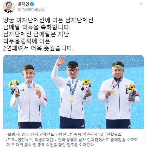 문재인 대통령은 도쿄올림픽 양궁 남자단체전에서 금메달을 딴 오진혁·김우진·김제덕 선수에게 "아낌없는 박수를 보낸다"며 축하했습니다.