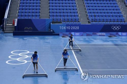 Workers push water off of a court during a rain delay in the tennis competition at the 2020 Summer Olympics, Tuesday, July 27, 2021, in Tokyo, Japan. (AP Photo/Patrick Semansky)
