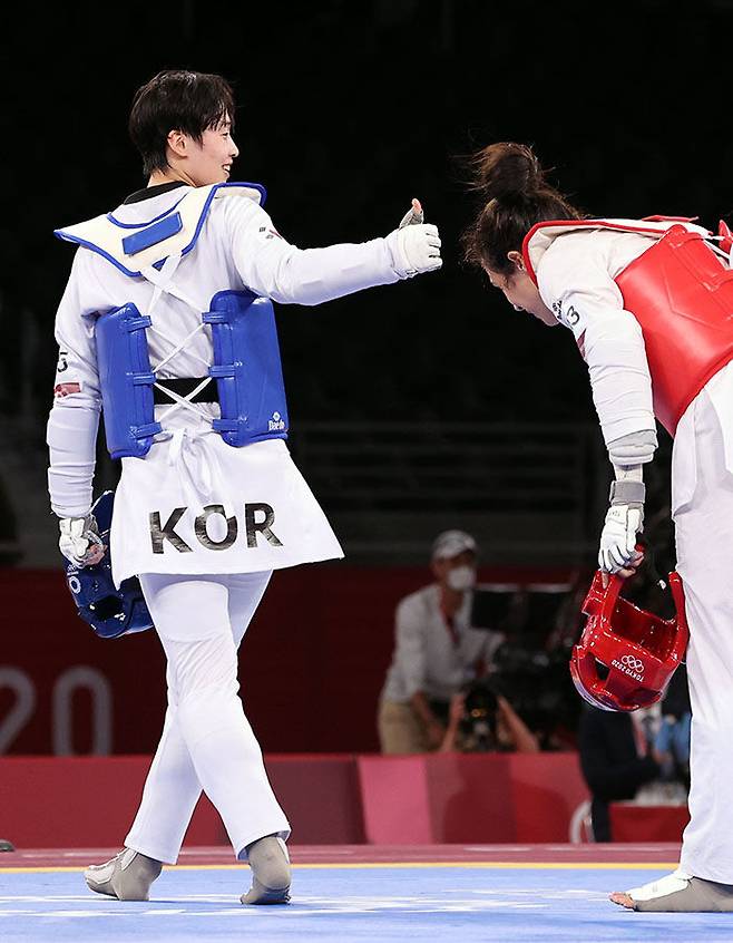 패배한 직후였지만 태권도 국가대표 이다빈(서울시청)은 승자를 향해 엄지를 들어 보였습니다.