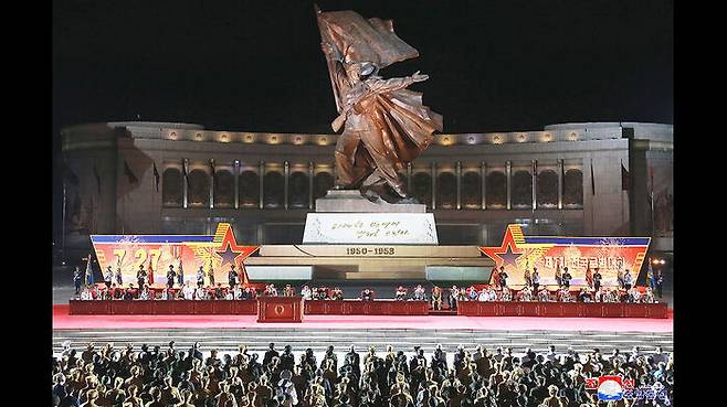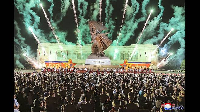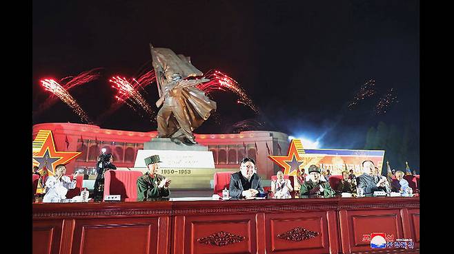 북한은 어제 노병대회를 평양의 '조국해방전쟁승리기념탑' 앞에서 진행했습니다. '조국해방전쟁'이란 6.25 전쟁을 가리키는 말입니다. 북한 매체들이 공개한 사진을 보니 행사는 한밤 중에 진행됐습니다. 평양도 폭염이 계속되고 있으니 밤중에 행사를 한 것으로 보입니다. 그런데 공개된 사진을 보면 형형색색의 불꽃이 발사되는 등 대규모 불꽃놀이와 함께 이뤄진 것으로 보입니다. 노병대회는 보통 실내에서 진행돼왔는데, 올해에는 야외에서 한밤중에 대규모 불꽃놀이와 함께 성대하게 진행된 것입니다.