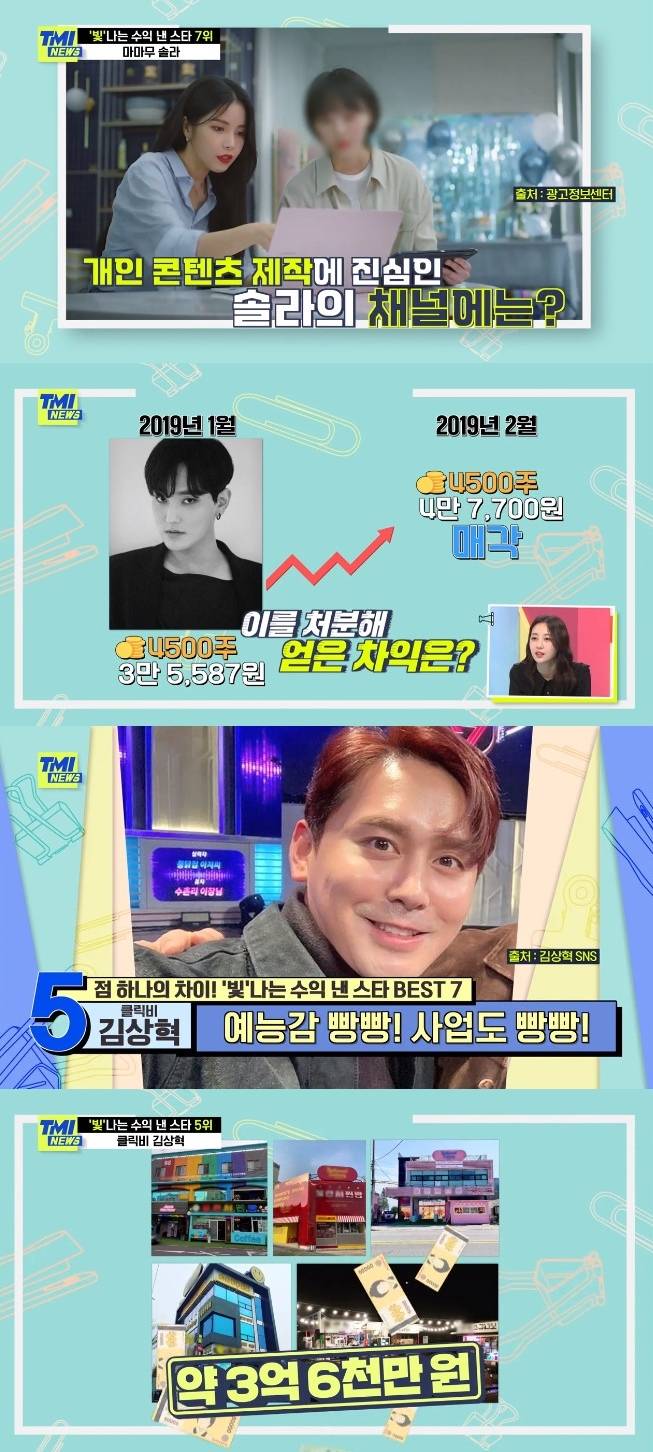 28일 방송된 Mnet 'TMI 뉴스'에서는 '빛나는 수익 낸 스타 BEST 7'이 공개됐다.
