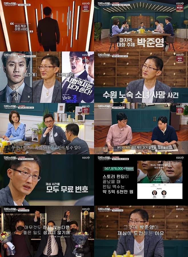 그런가 하면, 박준영 변호사는 무료 변호를 하다 파산을 하고, 그를 도우려는 사람들의 스토리 펀딩으로 5억 6천만 원을 모은 과거도 이야기했다. 그는 이에 대해 “세상이 더 좋아졌으면 하는 사람들의 마음, 의미 있는 일에 동참하고 싶은 마음이 있었던 것 같다”고 말했다. 이러한 마음들이 모여 박준영 변호사는 계속해 재심 사건을 할 수 있었다고. 지금도 경제적 상황이 좋지 않지만, 여전히 약자들을 위해 진실을 좇고 있는 그의 행보는 묵직한 울림을 남겼다.