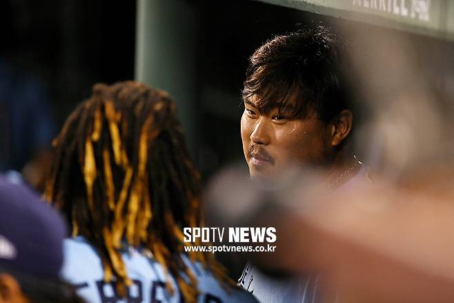 그리고 류현진이 더그아웃에 들어와 땀을 식히고 있을 때 투수 코치가 다가가 류현진과 이야기를 나눴습니다.