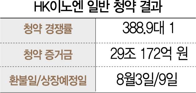 30일 대표 주관사인 한국투자증권에 따르면 HK이노엔의 일반 청약 경쟁률이 388.9 대 1로 집계됐다.