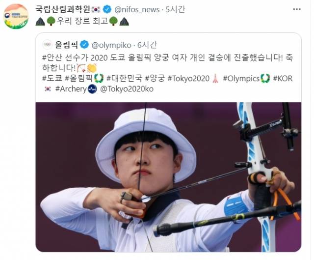 국립산림과학원은 국제올림픽위원회(IOC) 공식 트위터 한국어 계정에 올라온 안산의 개인 결승 진출 게시글을 공유하면서 “우리 장르 최고”라고 극찬을 남겼다. 선수의 한자 이름인 ‘安山’의 산이라는 공통점을 굳이 끄집어내 서로를 엮은 것이다.