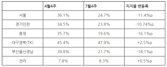 다음은 지역별 지지율 변화를 보겠습니다. 윤 전 총장의 지역 기반은 TK와 충청으로 알려져 있는데, 꼭 그런 것만은 아닙니다. TK 강세는 분명하나 사실 지역별로 고른 지지를 받고 있었습니다. 4월까지만 해도.