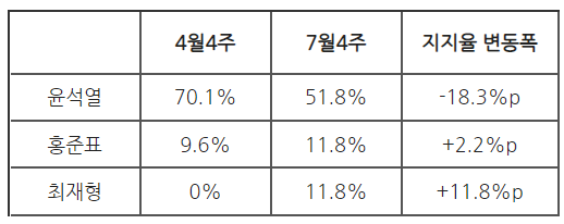 7월 하순 '쥴리 벽화' 논란이 있었고 윤 전 총장의 국민의힘 입당 결심 소식이 전해졌습니다. 본지의 다음번 여론조사는 8월 7~8일 진행됩니다. 윤 전 총장이 반전의 기회를 마련할지, 최 전 원장으로의 지지율 이전이 가속화될지, 해당 조사에서 어느 정도 윤곽이 잡힐 것입니다. 8월 1주차 여론조사 결과는 내달 10일 보도됩니다. 많은 기대 바랍니다.